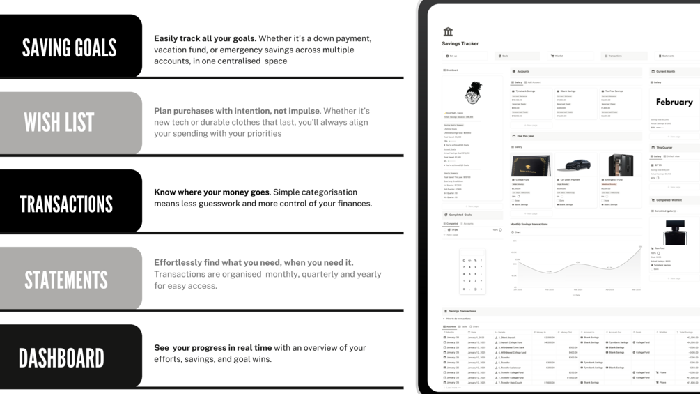 → Easily track all your goals. Whether it’s a down payment, vacation fund, or emergency savings across multiple accounts, in one centralised space.